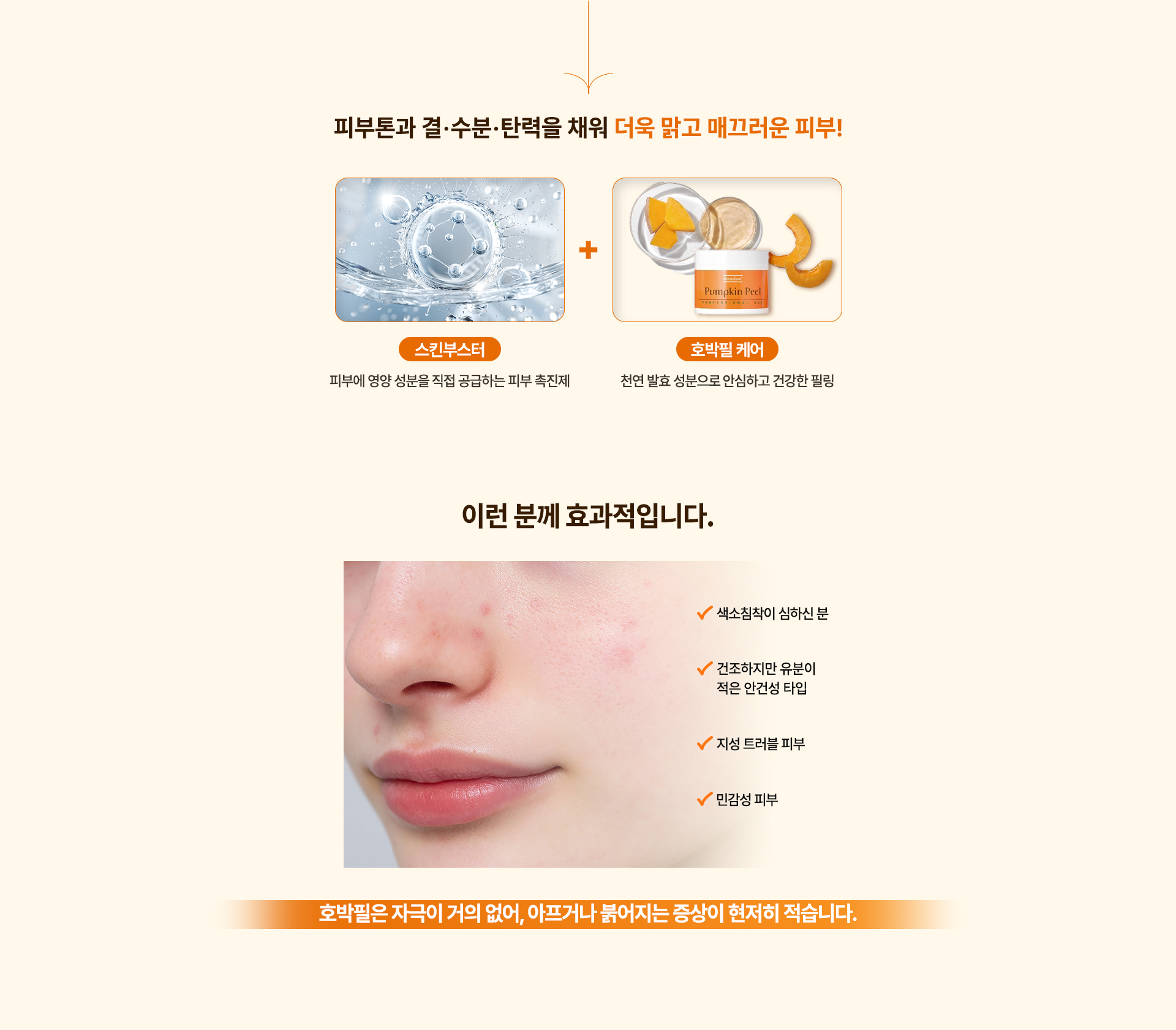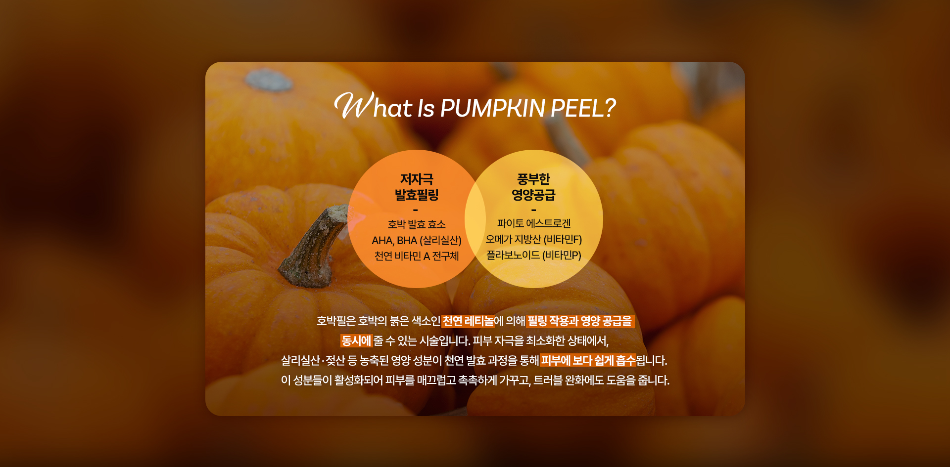 호박필은 천연적으로 발효된 영양 필링으로, 피부에 필링작용과 영양공급이 동시에 이루어져 피부가 즉각적으로 매끄럽고 촉촉한 효과를 볼 수 있습니다.